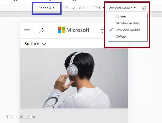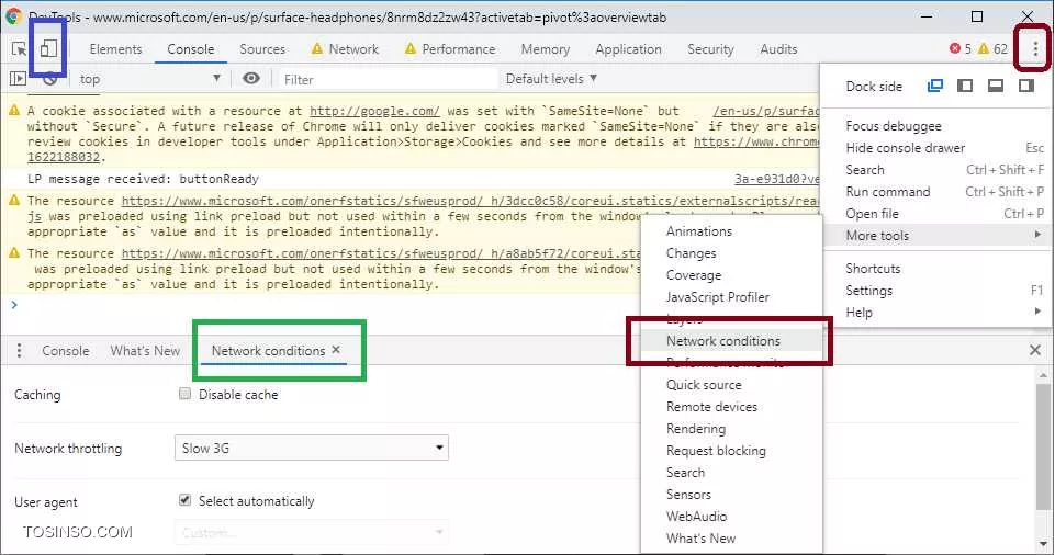 اکثر توسعه دهنده های نرم افزار از سیستم سخت افزاری نسبتا قوی و اینترنت پرسرعت استفاده میکنن  در نتیجه به احتمال زیاد در زمان تست وب سایت بروی مرورگر متوجه کارایی و سرعت پایین وب سایت نمیشن. تمام کاربران یک وب سایت اینترنت پرسرعت یا دستگاه های قوی ندارن (مثلا خیلی از گوشی های هوشمند هستن که از نظر سخت افزاری قوی نیستن یا اینکه کاربر از اینترنت پرسرعت استفاده نمیکنه). خوب چطور میتونیم عملکرد سایتی که طراحی کردیم رو بروی اون دستگاه ها تست کنیم ؟ خوب در ابتدا سایت موردنظرتون (مثلا Microsoft.Com) رو توی Chrome باز کنین و کلید F12 رو بزنین تا DevTools باز بشه . مشابه عکس زیر ، روی سه نقطه ی سمت راست بالا کلیک کنین ، گزینه ی More Tools و بعد از اون روی Network Conditions بزنین .