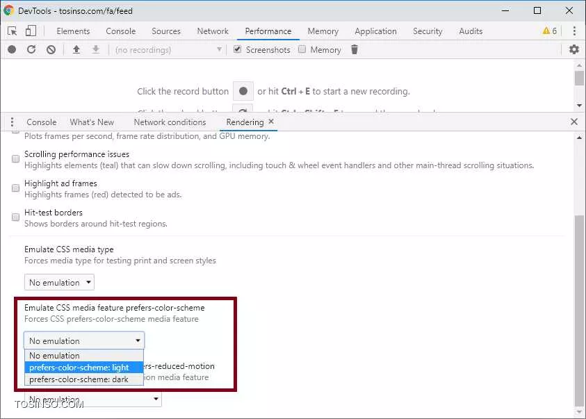 پراپرتی prefers-color-scheme این امکان رو میده تا بتونین تشخیص بدین که کاربر از تم روشن یا تاریک در سیستمش استفاده میکنه. حالا برای اینکه این مورد رو روی سایتمون تست کنیم نیازی نیست تا داخل تنظیمات سیستم تغییری ایجاد کنیم و خروجی رو بررسی کنیم .برای اینکار مثل قبل دکمه های CTRL+SHIFT+P رو بزنین و  عبارت Show rendering رو بنویسین و از لیست پیشنهادی انتخابش کنین.