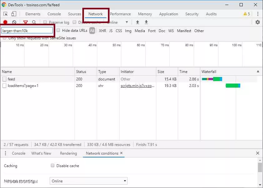 یکی از ویژگی های جالب Chrome DevTools امکان فیلترکردن درخواست های شبکه هست. مثلا میتونین بگین فقط درخواست هایی رو نمایش بده که حجمشون بیشتر از 10 کیلوبایت هست: larger-than:10k . برای اینکار در پنجره ی DevTools ، به تب Network برید و در کادر فیلتر عبارت larger-than:10k رو بنویسین.