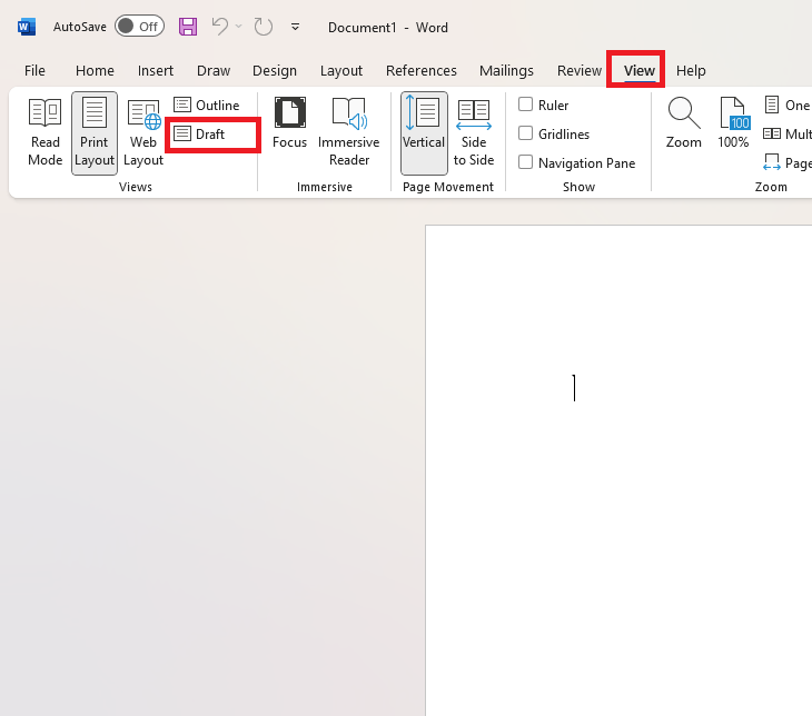 ۱. تغییر نمای دید به حالت Draft به طور معمول ما در حالت Print Layout کار می‌کنیم، اما برای ویرایش خط پاورقی باید نمای سند را تغییر دهیم.