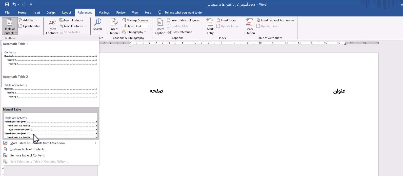 پس از اتمام کار مکان نما را به صفحه ای منتقل کنید که می خواهید فهرست در آن ایجاد شود. از تب Reference و منوی Table Of Contents یکی از قالب ها را به دلخواه انتخاب می کنیم.