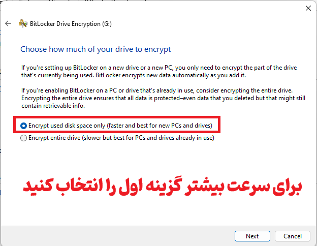 شما می توانید در دو حالت مختلف فعال شدن بیت لاکر را تعریف کنید. حالت اول فقط فضای استفاده شده از پارتیشن ، فلش مموری را رمزنگاری می کند یعنی اگر شما درون دیسک یا پارتیشن خود فقط 10 گیگاباید اطلاعات دارید ، فرآیند رمزنگاری شما برای همان 10 گیگابایت انجام می شود و هر بار که بخواهید داده جدیدی به پارتیشن اضافه کنید ، خودکار داده جدید رمزنگاری و اضافه خواهد شد ، این همان موردی است که زمانیکه گزینه اول یعنی " Encrypt used disk space only (faster and best for new PCs and drives) را انتخاب می کنید انجام می شود. این روش فعال سازی بیت لاکر سریعتر انجام می شود. زمانیکه گزینه دوم یعنی " Encrypt entire drive ( slower but best for PCs and drives already in use) " را انتخاب کنید ، کل پارتیشن شما بدون در نظر گرفته اطلاعاتی که درون آن است ، رمزنگاری می شود. در چنین حالت فعال سازی بیت لاکر ، سرعت رمزنگاری در مرتبه اول بسیار کند پیش می رود اما در مراحل بعدی سرعت کار بیشتر می شود. گزینه اول را زمانی بیشتر استفاده می کنیم که فلش مموری یا هارد اکسترنالی داریم که دائما در حال تغییر و جابجایی هستند و گزینه دوم را زمانی استفاده می کنیم که پارتیشن یا هارد دیسک روی سیستم ما سوار شده است و همیشه روی آن قرار دارد. ما در این سناریو گزینه پیشفرض را انتخاب می کنیم و Next را می زنیم.
