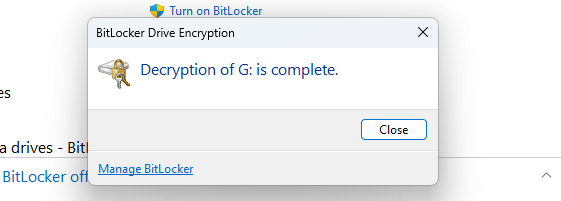 غیرفعال کردن بیت لاکر اصلا کار سختی نیست ، بعد از اینکه رمز فلش یا هارد اکسترنال را وارد کردید ، کافیست در تنظیمات بیت لاکر ، روی گزینه Turn Off Bitlocker کلیک کنید و اجازه بدهید بیت لاکر فرآیند غیرفعال شدن را طی کند تا رمزنگاری از روی فلش مموری حذف شود. هرگاه پیغام زیر را دیدید ، بیت لاکر به کلی غیرفعال شده است