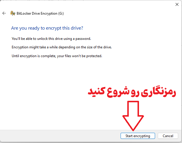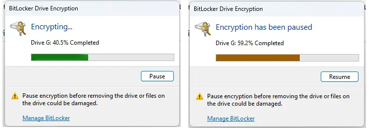 - نکته بسیار بسیار مهم : در زمان انجام شدن فرآیند رمزنگاری شما می توانید دکمه Pause را بزنید و فرآیند را متوقف کنید و دکمه Resume را بزنید و فرآیند را ادامه دهید اما به هیچ عنوان تلاش نکنید که در حین انجام فرآیند آن را کنسل کنید. اینکار باعث صدمه خوردن جدی اطلاعات روی هارد دیسک یا فلش مموری شما می شود و ممکن است باعث خراب شدن پارتیشن و دیسک و غیرقابل بازیابی شدن اطلاعات شود. در صورتیکه از فعال کردن بیت لاکر منصرف شده اید ، هیچ چاره ای ندارید جز اینکه صبر کنید فرآیند کامل شود و سپس فرآیند غیرفعال کردن بیت لاکر را انجام دهید.