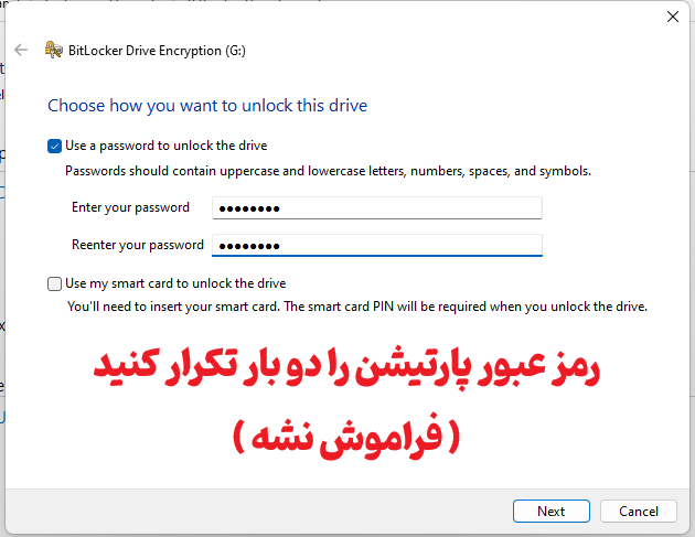 قابلیت بیت لاکر به عنوان پسورد گذاشتن روی هارد دیسک ، پسورد گذاشتن روی پارتیشن یا پسورد گذاشتن روی فلش مموری هم شناخته می شود ، در واقع پسوردی که ما روی بیت لاکر قرار می دهیم ، کلید رمزنگاری آن است. در این مرحله دو بار پسورد مورد نظر خودتان را تکرار کنید ، مطمئن بشوید که پسورد را به خوبی به خاطر داشته باشید و فراموش نکنید ، گزینه دوم به کار شما نمی آید ، برای زمانی است که به جای پسورد ، می خواهید از کارت های هوشمند استفاده کنید که در مبحث این مقاله نیست ، پسوردی که در این مرحله استفاده می کنید ، در مرحله بعدی برای ساخت کلید ریکاوری ( بازیابی ) در زمان فراموش کردن پسورد ، استفاده می شود ، تا جای ممکن پسورد امن و قدرتمند ایجاد کنید و دکمه Next را بزنید.