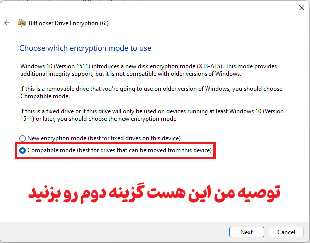 در قسمت بعدی نوع الگوریتم رمزنگاری به شما پیشنهاد می شود. در این مرحله توصیه من این هست که گزینه دوم یعنی Compatible Mode را انتخاب کنید ، چون ممکن است فلش یا هارد اکسترنال را به سیستم عامل قدیمی تر متصل کنید و نیاز به استفاده از آن داشته باشید و اگر حالت Compatible را انتخاب نکرده باشید ، ممکن است الگوریتم های رمزنگاری که در زمان فعال سازی بیت لاکر انتخاب کرده این با سیستم عامل قدیمی هماهنگی نداشته و نتوانید از محتوای پارتیشن و فلش استفاده کنید ، گزینه دوم را طبق تصویر انتخاب کنید و Next را بزنید.