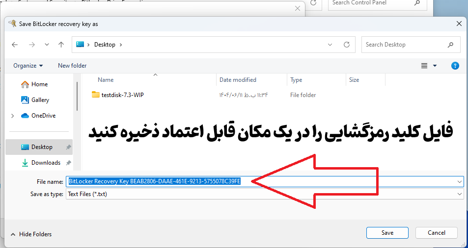 - نکته : این کلید بسیار بسیار بسیار حیاتی است. اگر یک درصد احتمال می دهید که رمز عبور خود را ممکن است فراموش کنید ، این کلید را در یک جای مطمئن قرار بدهید ، پرینت فیزیکی کار بسیار منطقی است ، می توانید آن را در یک پوشه در کمد قرار بدهید ، فایل ریکاوری را هم در یک محل مطمئن ذخیره کنید ، به هیچ عنوان کلید ریکاوری را درون پارتیشن یا محلی که در حال رمزنگاری شدن است قرار ندهید ، این موضوع را جدی بگیرید ، در صورت فراموشی رمز عبور و نداشتن کلید ریکاوری اطلاعات " اطلاعات شما غیرقابل بازگشت خواهند شد "