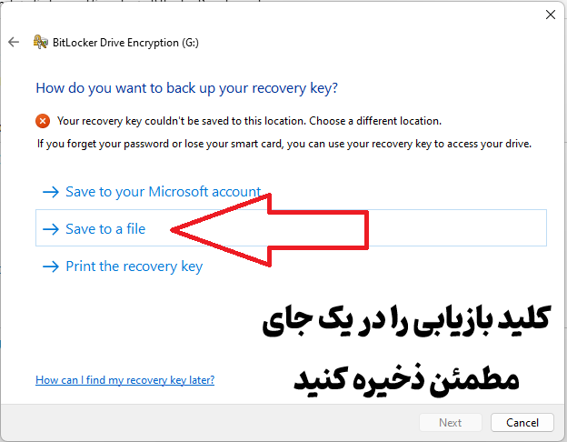 در این مرحله شیوه ذخیره سازی کلید رمزگشایی به شما پیشنهاد می شود. به زبان ساده تر ، با توجه به پسوردی که در مرحله قبلی وارد کردید ، بیت لاکر این احتمال را می دهد که ممکن است یک روز شما پسورد خودتان را فراموش کنید و به همین دلیل از شما می خواهد که کلید ریکاوری یا بازیابی اطلاعاتی که برای روز مبادا ساخته است را در جایی مطمئن نگهداری کنید. برای این موضوع به شما سه پیشنهاد می دهد ، گزینه اول اینکه در فضای ذخیره سازی که در شبکه ابری مایکروسافت ( Microsoft Account ) در نظر گرفته شده است آپلود کنید ، برای خودتان ایمیل کنید ، یا بصورت دستی در جای هارد دیسک ذخیره کنید یا در بهترین حالت ممکن کلید ریکاوری خود را پرینت فیزیکی بگیرید . در این مرحله گزینه Save to file را بزنید و Next را بزنید.
