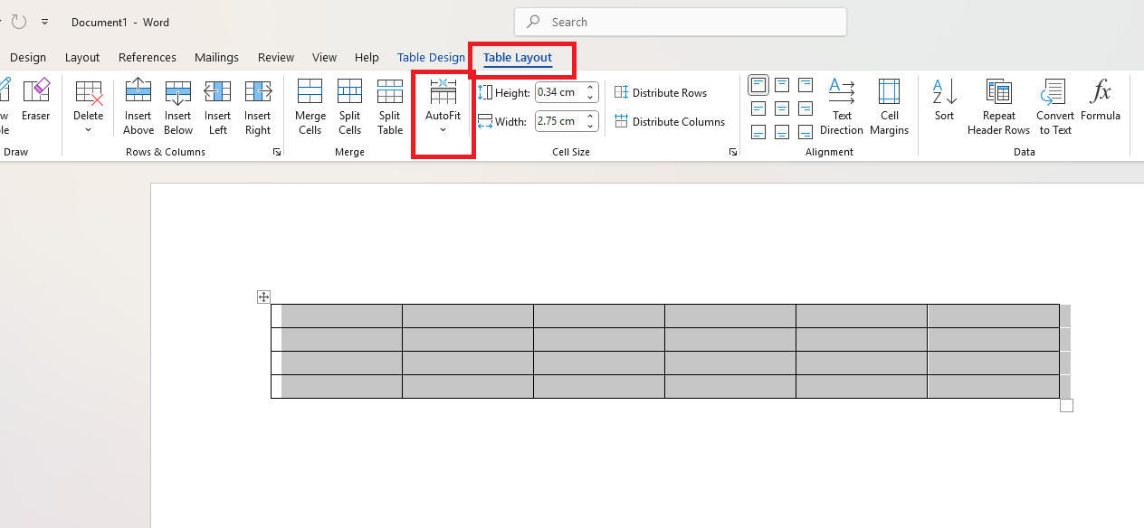- برای این کار کافیست روی جدول کلیک کنید، به تب Layout (در نوار بالای ورد) بروید.