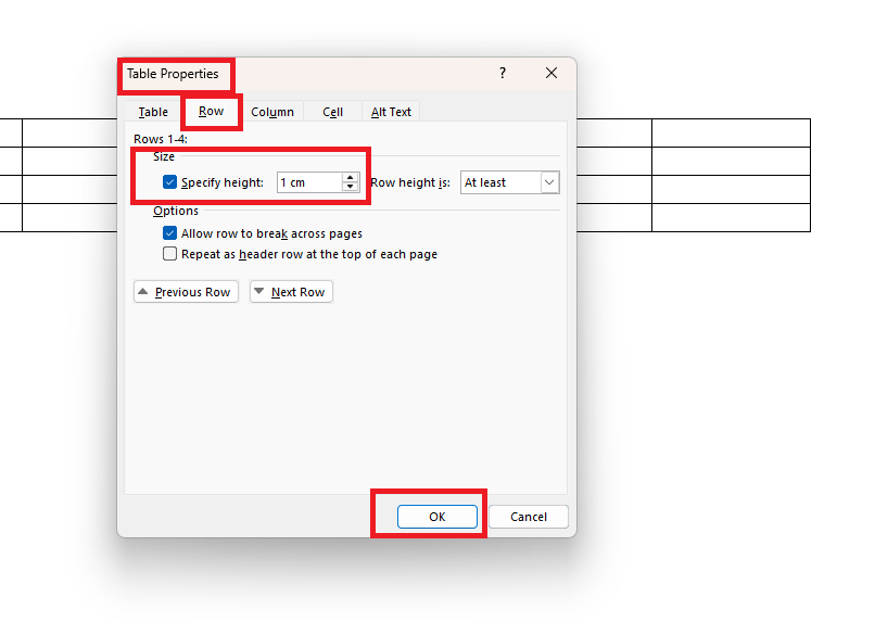 - نکته طلایی اینجاست: در قسمت Row height is، گزینه را از حالت At least (حداقل) به Exactly (دقیقا) تغییر دهید.