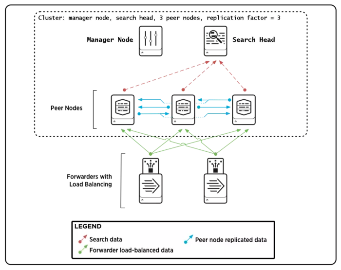 توجه داشته باشید که در این حالت ما چندین Splunk Node (البته در این حالت بیشتر Indexer ها در نگاهمان میباشند) داریم و داده های موجود در این Splunk Node ها بین یک دیگر اشتراک گذاری و همگام سازی میشود و به اصطلاح دیگر در این حالت Indexer هایمان در Splunk Node های ما داده هارا بین خود همگام سازی و یکسان سازی میکنند که به اصطلاح به این موضوع و این حالت Index Replication نیز گفته میشود.