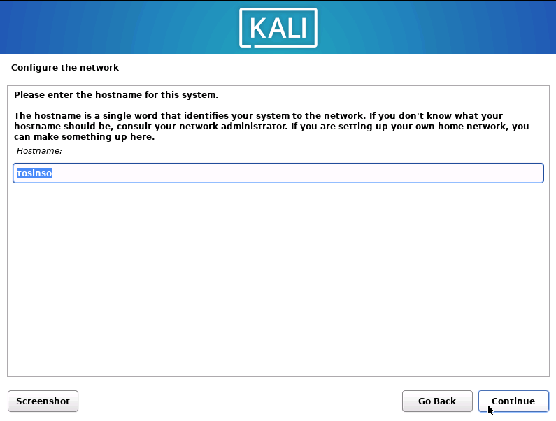 این نام درشبکه برای شناسایی دستگاه شما استفاده میشه .اگرسیستم رو برای استفاده شخصی نصب میکنید،میتونیدیک نام دلخواه مانند kali وارد کنید وگزینه ی Continue رو بزنید تا به مرحله بعد بروید