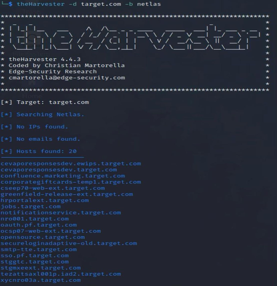 ابزار the Harvester پوشش گستردهای از منابع مختلف اطلاعاتی از جمله موتورهای جستجو، شبکههای اجتماعی و پایگاههای داده ارائه میدهد. با یکپارچه شدن با Netlas API، این ابزار به دادههای دقیقتری درباره ی نام دامنه ها و دستگاههای شبکه دسترسی پیدا میکند و بینش عمیقتری از زیرساختها فراهم می کند.