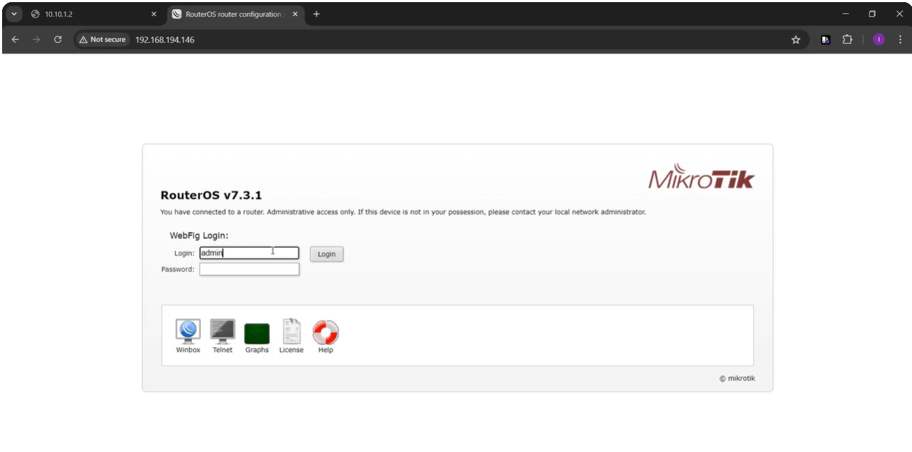 همچنین اگر IP میکروتیک(در اینجا 192.168.194.146 در سمت کارت شبکه bridge و 10.10.1.1 در سمت کارت شبکه segment1 است) را در مرورگر هاست اصلی وارد کنیم وارد صفحه تنظیمات میکروتیک می شویم و خبری از وب سرور نیست.!(تصویر شماره 7)
