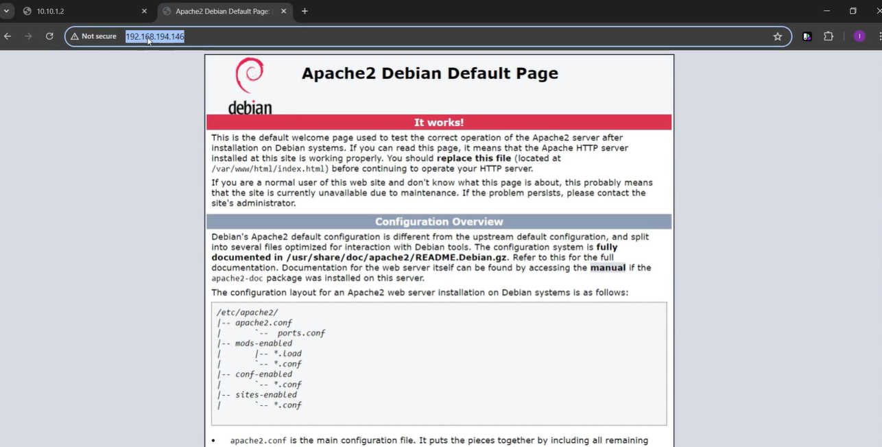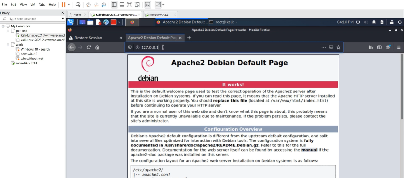 حالا برای اطمینان از فعال بودن وب سرور، داخل مرورگر خودش (kali linux)، IP loopback را می زنیم و خواهیم دید که وب سرور فعال است. (تصویر شماره 6). اما زمانیکه در مرورگر هاست اصلی IP آن وب سرور را (در اینجا 10.10.1.2) بزنیم خواهیم دید که در دسترس نبوده و خطا می دهد.