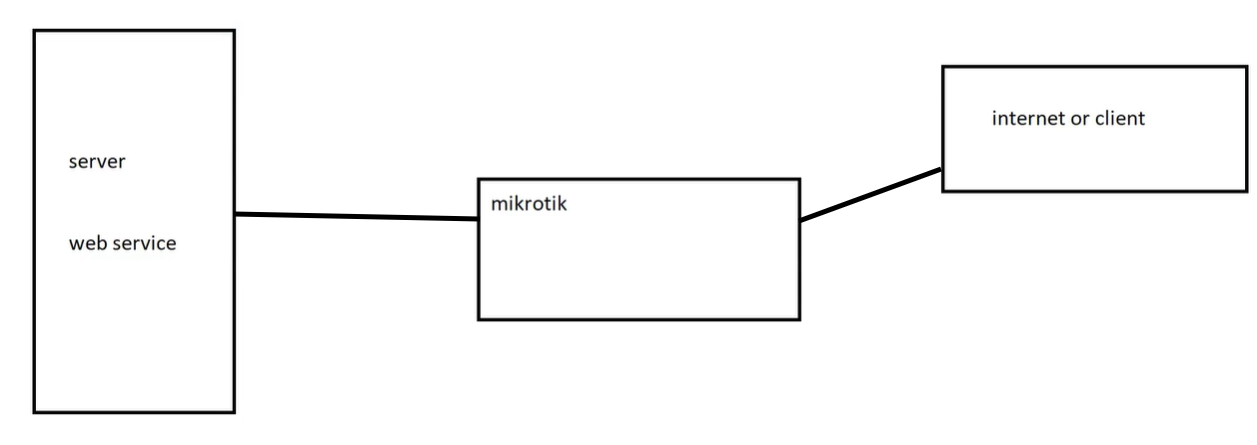 خب حالا فرض کنید که ما در شبکه داخلی یک سرور داریم که سرویس یا خدماتی را ارائه می دهد (مثلا یک وبسایت اجرا شده، یک VPN سرور برای اتصال پرسنل دورکار راه اندازی شده یا ...) و دستگاه میکروتیک در این سناریو به عنوان ورودی و خروجی شبکه (edge یا لبه شبکه) در نظر گرفته شده است (در عمل هیچ تفاوتی بین دستگاه ها و برندهای مختلف وجود نداره و مفهوم و نحوه پیاده سازی یکسان هستش اما چون در بیشتر شرکت های تا سطح متوسط در ایران معمولا روترهای میکروتیک به عنوان ورودی و خروجی شبکه استفاده می شن در این سناریو از اون استفاده می کنیم) و مشتریان و کلاینت ها و کسانی که از اینترنت قرار است این وبسایت را ببینند یا به vpnسرور وصل شوند، در سمت دیگر قرار دارند (مطابق تصویر 3)