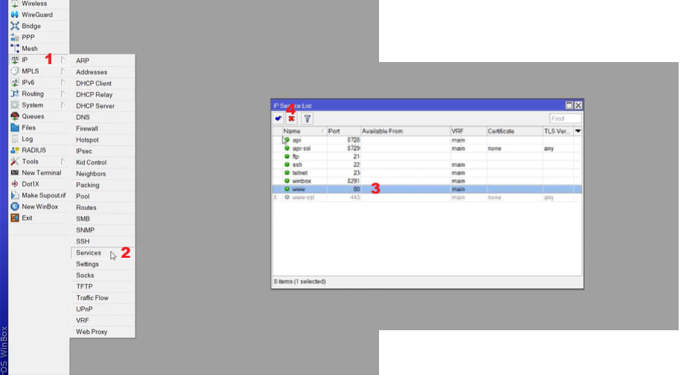 ابتدا در میکروتیک به مسیر زیر رفته و سرویس وب خود روتر را خاموش میکنیم(چون وب خود میکروتیک هم بر روی پورت 80 کار میکند تداخل ایجاد می شود پس بهتر است که آن را غیر فعال کنیم) (تصویر شماره 8)