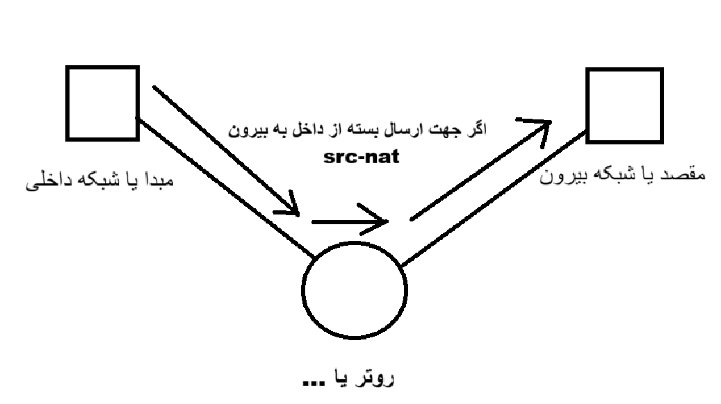 حالا اگر بسته ای از سمت یک دستگاه شبکه داخلی قصد داشته باشه به سمت بیرون بره این روتر یا ...، IP مبدا که دستگاه درخواست کننده هست رو برداشته و IP خودش رو به جای مبدا قرار داده و ارسال میکنه که به این نوع src-nat میگیم چرا؟ چون IP مبدا داره تغییر میکنه.