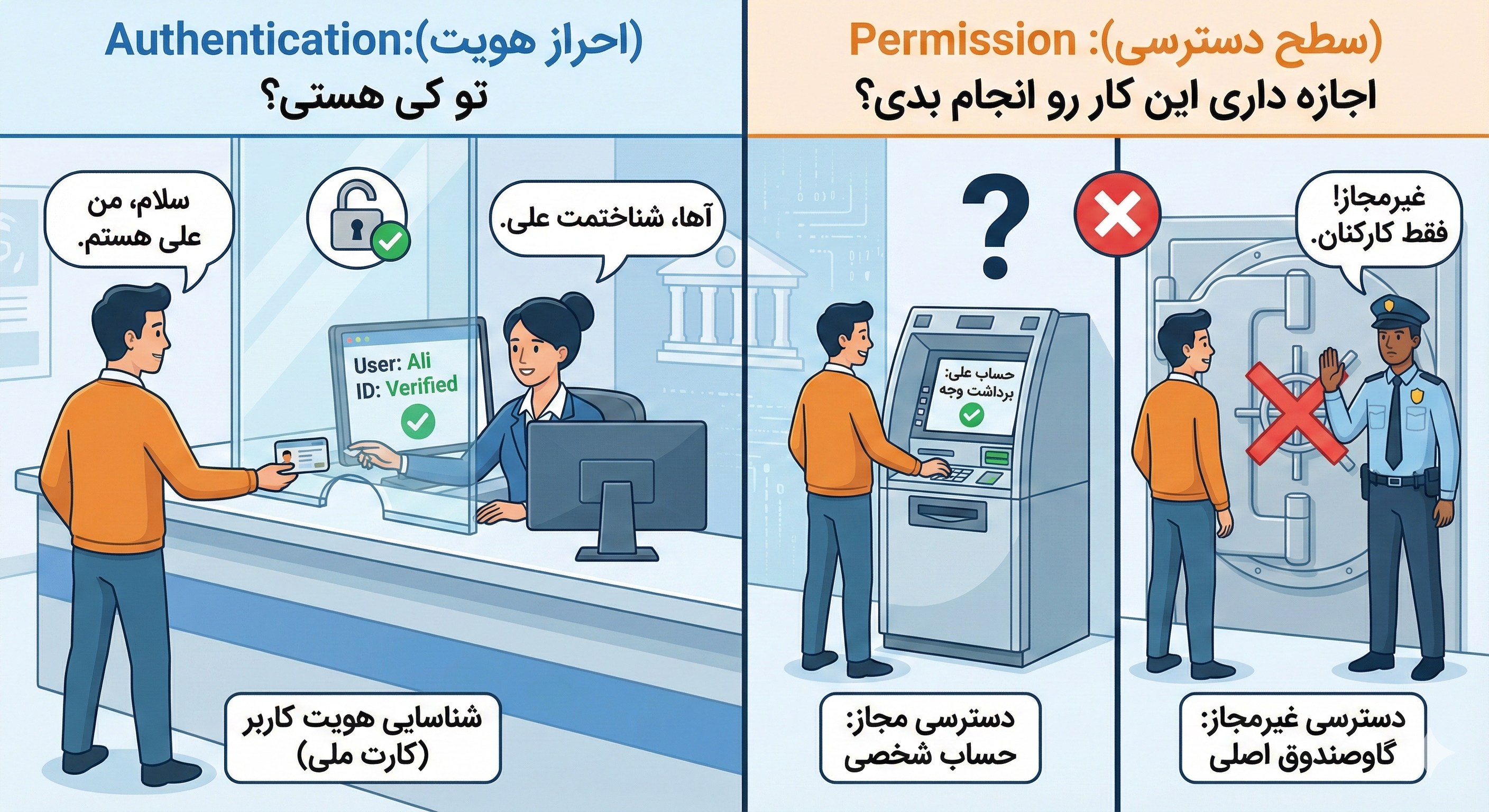 مثال ساده: وقتی میری بانک، کارت ملی نشون میدی تا بفهمن تو کی هستی (Authentication). اما حتی اگر بشناسنت، اجازه نمیدن بری توی گاو صندوق اصلی بانک پول برداری (Permission)، فقط اجازه داری به حساب خودت دسترسی داشته باشی.