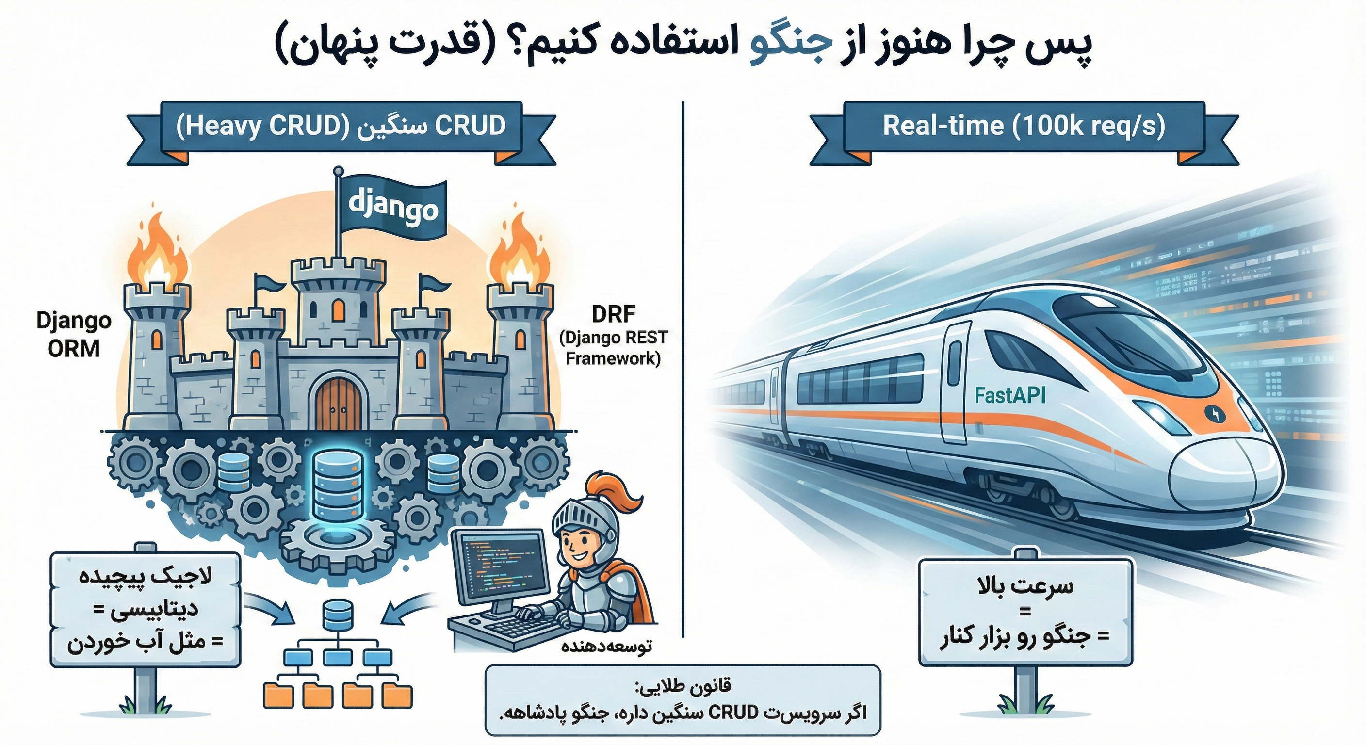 قانون طلایی: اگر سرویس ت CRUD سنگین داره (یعنی همش با دیتابیس و فرم و ولیدیشن درگیره)، جنگو پادشاهه. اگر سرویست قراره ۱۰۰ هزار تا درخواست در ثانیه رو پردازش کنه (Real-time)، جنگو رو بزار کنار.