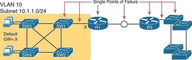 در این شکل، چندین مؤلفه به‌عنوان نقطه SPOF مشخص شده‌اند. اگر هر یک از این اجزا دچار خرابی شوند، بسته‌ها دیگر قادر نخواهند بود از سمت چپ شبکه به سمت راست آن منتقل شوند.