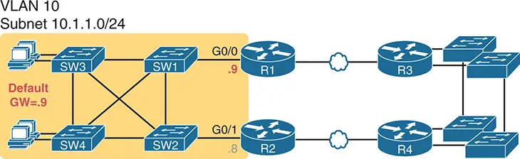 تا اینجای کار از نظر مسیرها و تجهیزات فیزیکی افزونگی را کامل رعایت کرده ایم اما هنوز نمیتوانیم به صورت بهینه از این افزونگی استفاده کنیم. در تصویر بالا کلاینت ها از روتر R1 به عنوان گیتوی خود استفاده می کنند و در صورتی که برای این روتر یا ارتباطات آن مشکلی بوجود آید ارتباط کلاینت با شبکه WAN قطع خواهد شد. یک راه حل این است که کلاینت ها در این زمان گیتوی خود را به روتر R2 تغییر دهند. راه حل بعدی این است که IP روتر R1 را روی روتر R2 قرار دهیم. یا راه حل دیگر این است که نیمی از کلاینت ها از R1 به عنوان گیتوی خود استفاده کنند و نیمی دیگر از کلاینت ها از R2 به عنوان گیتوی استفاده کنند.