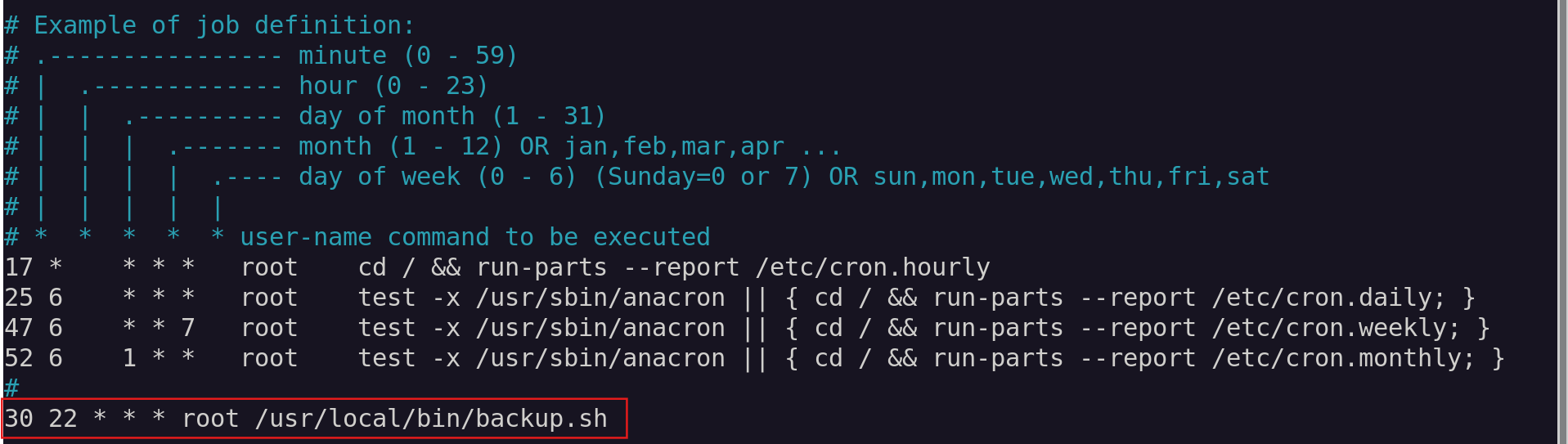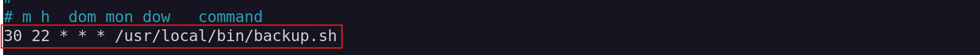 برای مثال میخواهیم که اسکریپت بک آپ ما در ساعت 22:30 و هرروز اجرا شود. برای اینکار با استفاده از یک ویرایشگرخط زیر را به فایل crontab اضافه میکنیم.