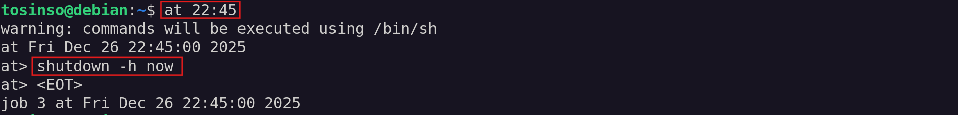 تصور کنید میخواهید در زمان مشخصی، مثلا ساعت 10:45 شب میخواهید که سیستم شما خاموش شود. بیاید این فرآیند رو با دستور at پیاده سازی کنیم.