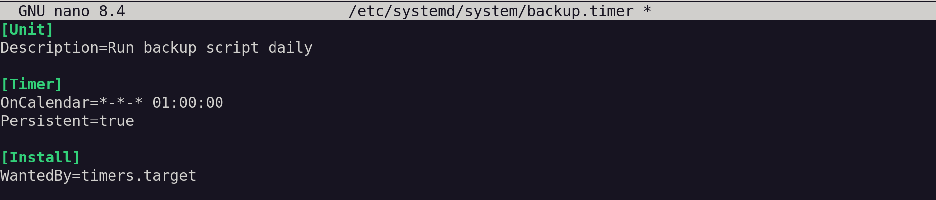 در فایل backup.timer عبارات و مقادیر زیر را وارد کنید.