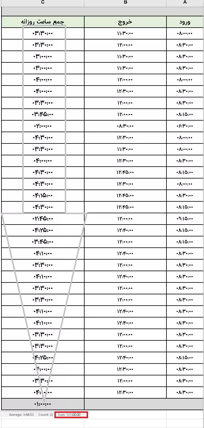 من یک فایل اکسل دارم که ساعت کاری در آن درج شده وقتی که سرجمع ساعت ها را انتخاب میکنم در نوار پایین 121ساعت میزنه ولی وقتی به سلول فرمول sum میدم سرجمع اشتباه میزنه